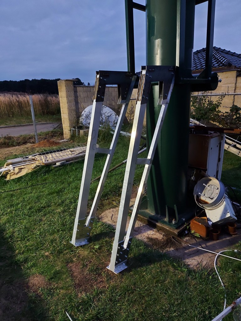 | Thanks to the weather today I could finish making the "legs" for holding the feedhorn in the parabolic dish. If the weather permits again, during the weekend I will install them on the balancing boom and I will also try to install the feedhorn support tubes. This would complete the main mechanical part and I will be able to do the first attempt with reception and calibration to the Sun noise. | |