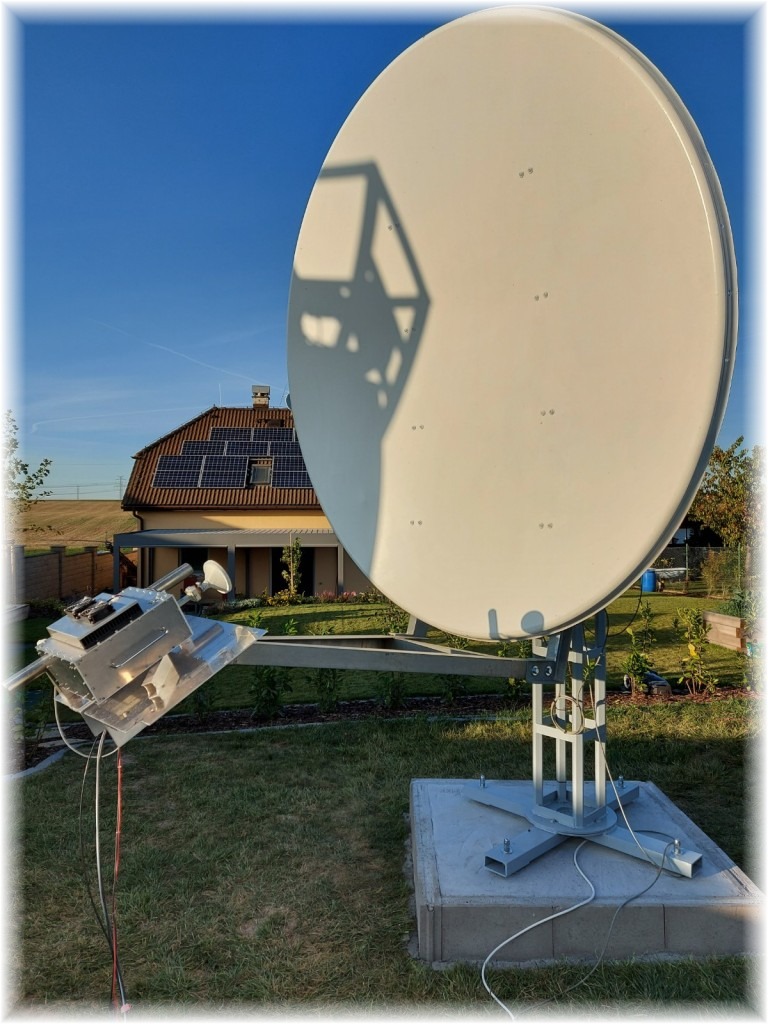 Here is a view of the TRV placed in the focal point of the dish. The original funnel with chokes for F/D 0,6 is used as feed
